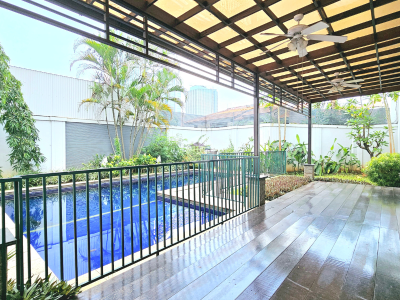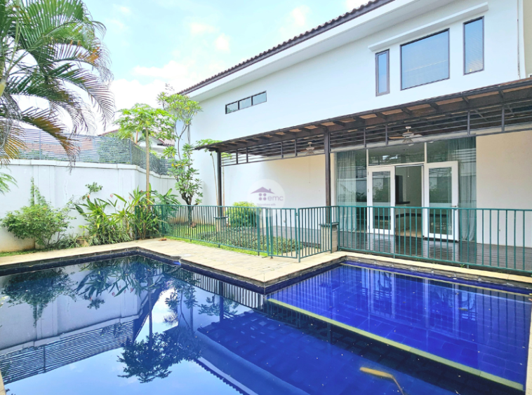 This is a homey and comfortable house in compound, this house is located in Cilandak, South Jakarta. There are more than 10 houses in this compound and every house has own swimming pool. This two story house has a beautiful garden at the back yard side by side with swimming pool. All of the kitchen is facing to the swimming pool.