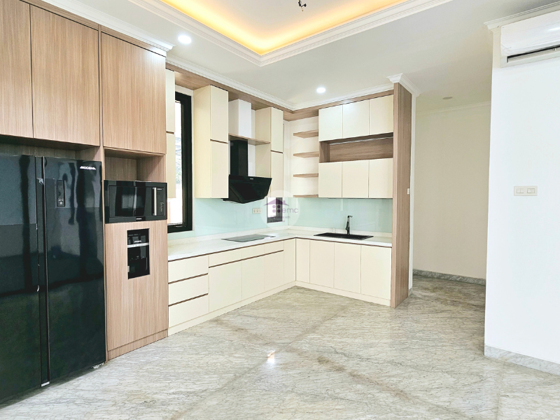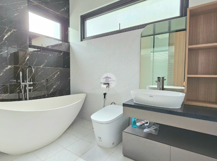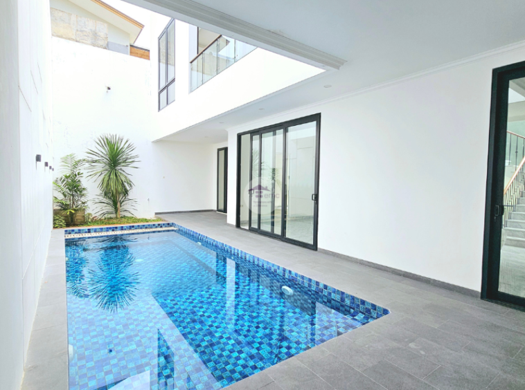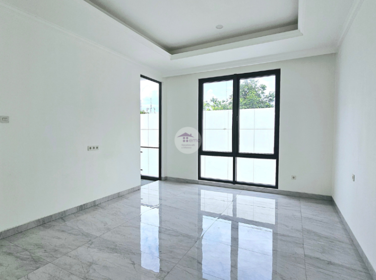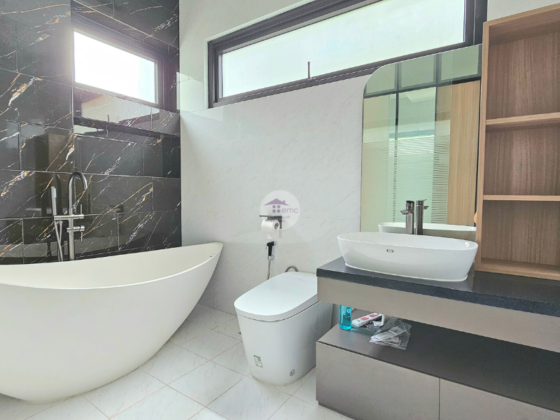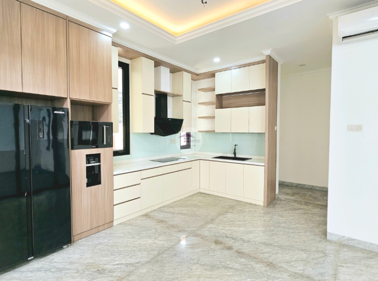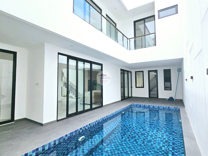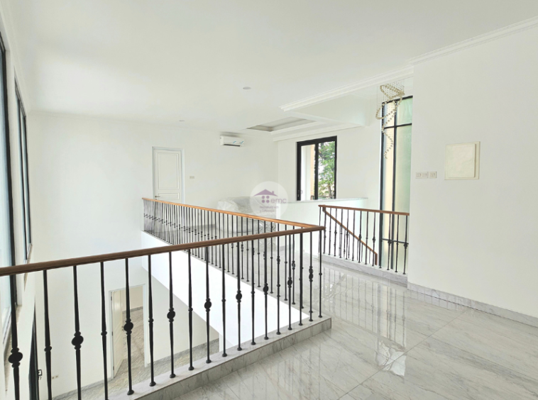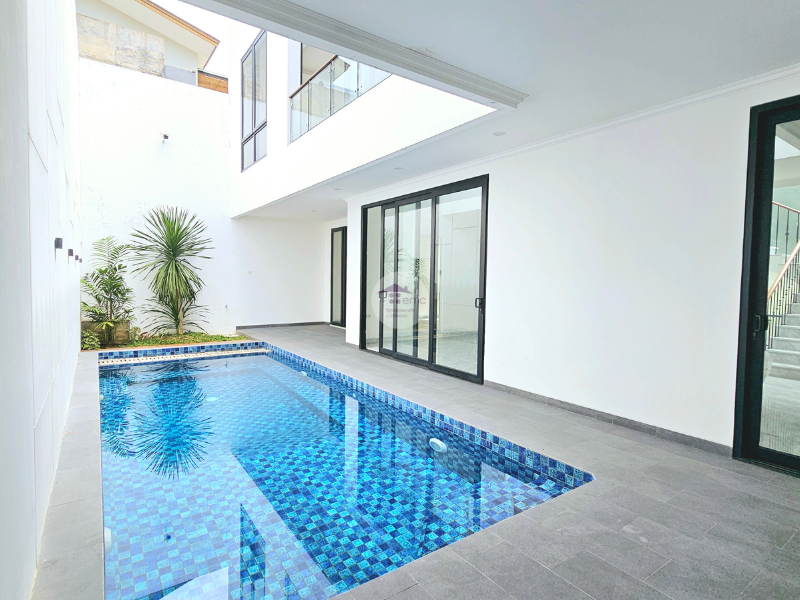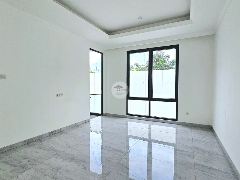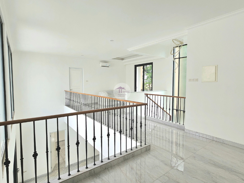 This modern and minimalist house is a brand new house. The entrance of the house there is a fish pond with limited garden. There are 4 bedrooms with ensuite bathrooms. This modern and minimalist house is very bright with hig ceiling. The brand new kitchen appliances with open kitchen style. The living room is open space concept with many windows. Living upstairs is also spacious with open style and bright. This house is suitable for young couple expatriate.
